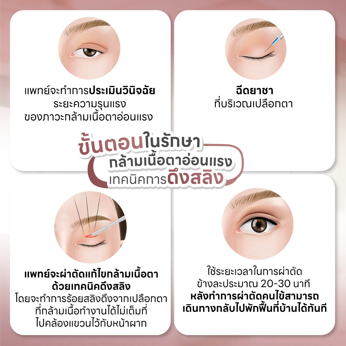 - แพทย์จะผ่าตัดแก้ไขกล้ามเนื้อตาด้วยเทคนิคดึงสลิง โดยจะทำการร้อยสลิงดึงจากเปลือกตาที่กล้ามเนื้อทำงานได้ไม่เต็มที่ไปคล้องแขวนไว้กับหน้าผาก ให้ใช้กล้ามเนื้อหน้าผากมาดึงยกหนังตาให้เปิด ดึงเพื่อให้กล้ามเนื้อเปิดตาทำงานให้มีประสิทธิภาพมากขึ้น