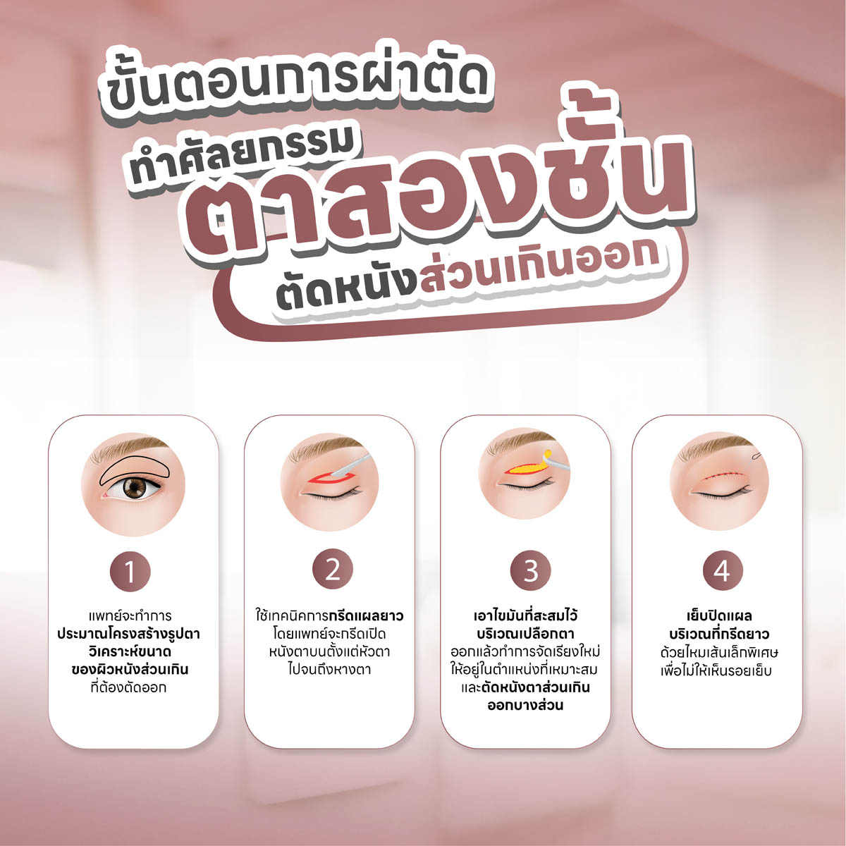 - ใช้ระยะเวลาในการผ่าตัดประมาณ 35-45 นาที หากต้องการชั้นตาหนาใหญ่ สามารถแจ้งความต้องการกับแพทย์ได้เลย