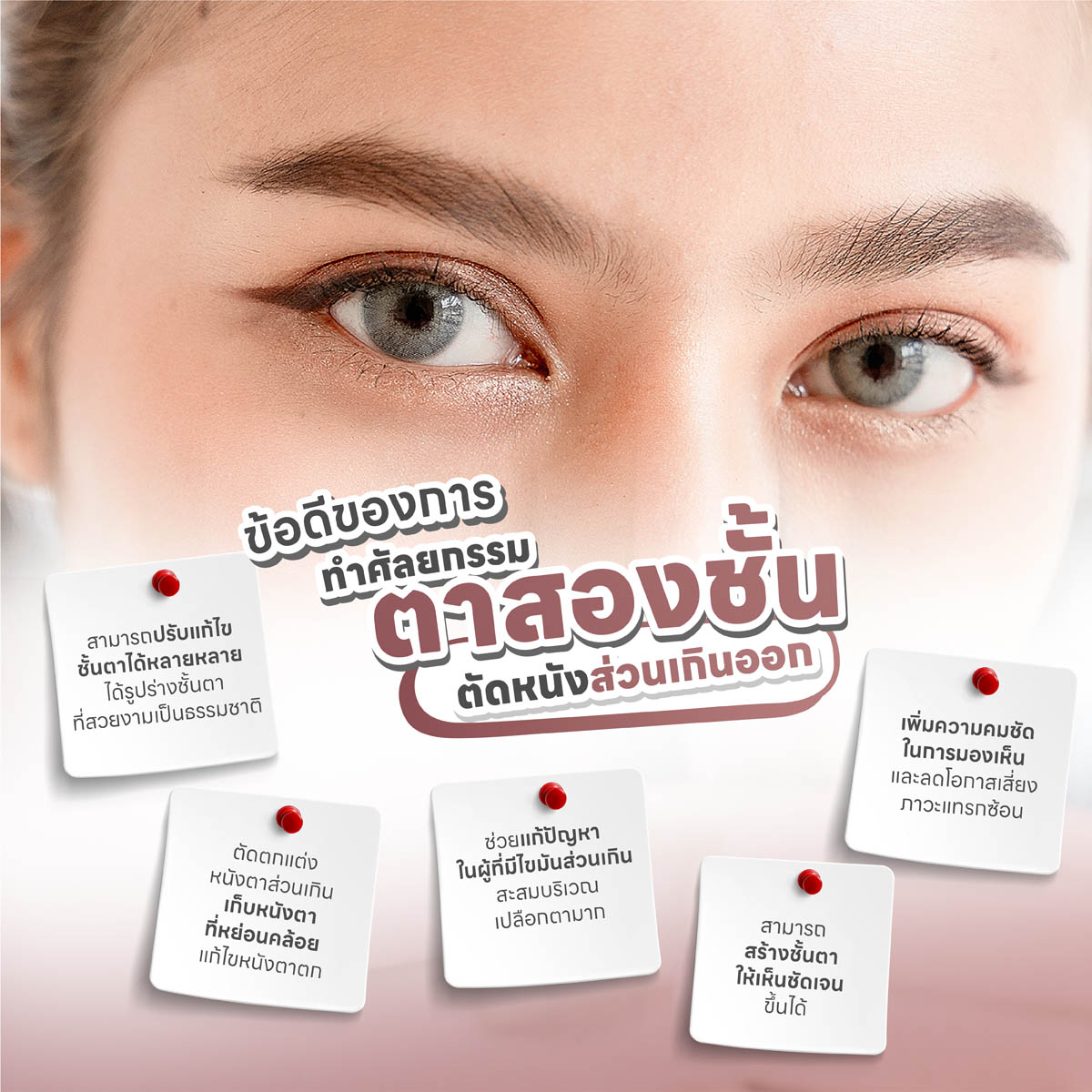 - ช่วยเพิ่มความคมชัดในการมองเห็น และลดโอกาสเสี่ยงภาวะแทรกซ้อนต่าง การตัดหนังตาส่วนเกินช่วยแก้ไขในผู้ที่มีปัญหาขนตาบนแยงตาๆ จากปัญหาหนังตาตกลงมาบดบังทำให้ต้องรู้สึกระคายเคืองตาหรือมีน้ำตาไหลซึม