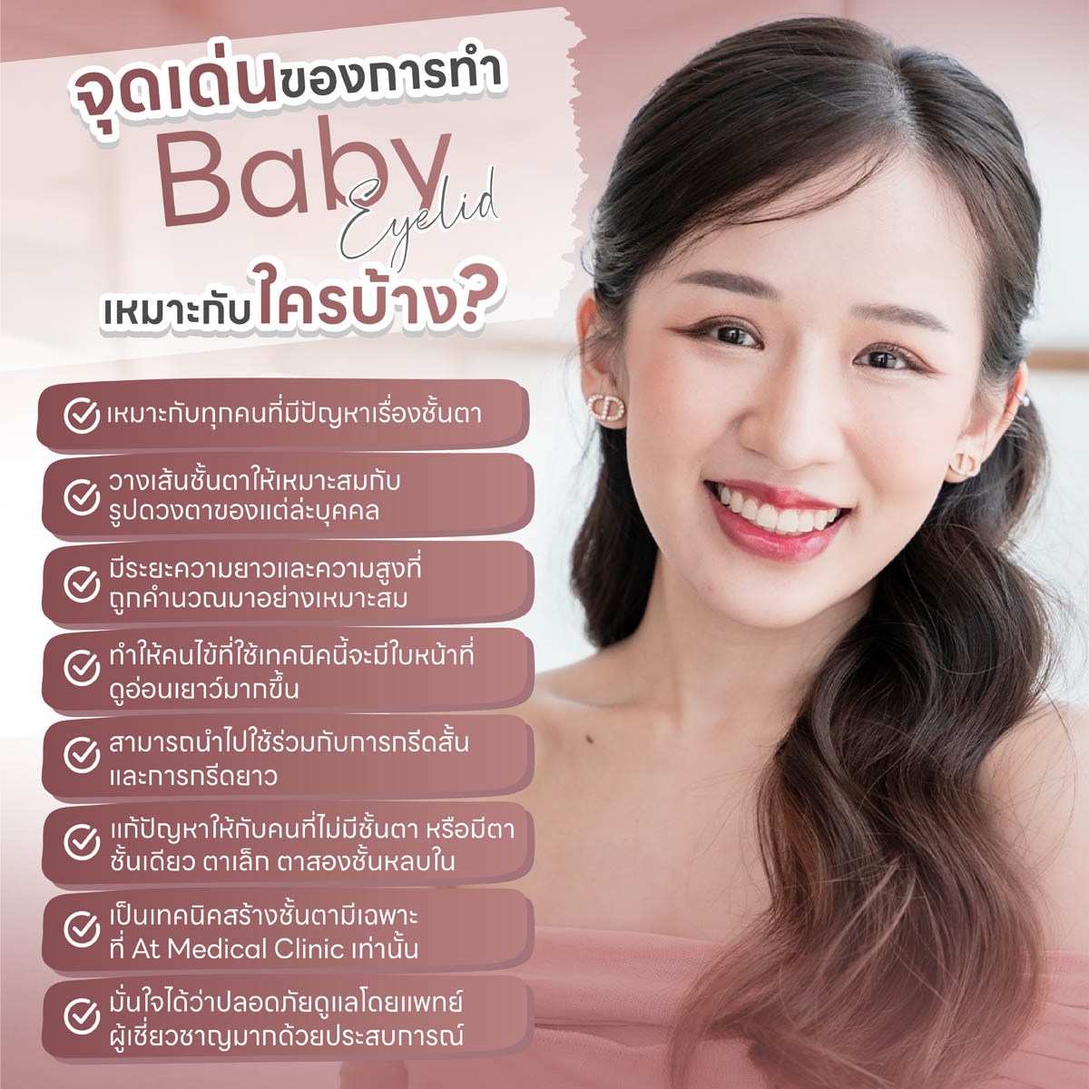 อยากมีดวงตากลมโต สดใส? คืนความอ่อนเยาว์ให้ใบหน้า Baby Eyelid คือเทคนิคการทำศัลยกรรมตาสองชั้นที่ถูกออกแบบมาเพื่อตอบโจทย์คืนความอ่อนเยาว์ให้ใบหน้า เป็นเทคนิคเฉพาะที่ At Medical Clinic เท่านั้น โดยการดีไซน์วางแนวเส้นโค้งขนานกับเปลือกตาและกระบอกตา เทคนิค Baby Eyelid จะถูกนำไปใช้ร่วมกับการสร้างชั้นตาได้หลากหลายรูปแบบ ไม่ว่าจะเป็นการศัลยกรรมตาสองชั้นแบบกรีดสั้นและกรีดยาว ,การตัดหนังตาส่วนเกิน ,เปิดหัวตาในผู้ที่มีปัญหาหัวตาปิดทำให้ตาดูสั้น แก้ปัญหาหนังตาตก ตาไม่เท่ากัน, แก้ปัญหาตาดุ ตาง่วง ตาสองชั้นหลบใน, ตาปรือ ตาขี้เกียจ , ตาเล็ก, ชั้นตาหนา, ตาชั้นเดียว, หรือแม้แต่การแก้ไขภาวะกล้ามเนื้อตาอ่อนแรง เพราะในทุกๆ การทำศัลยกรรมตาสองชั้น แพทย์จะต้องออกแบบการวางเส้นชั้นตา เพื่อให้ได้ชั้นตาที่คมชัดเหมาะสมก่อนแล้วจึงแก้ไขปัญหาตามอาการที่คนไข้เป็น