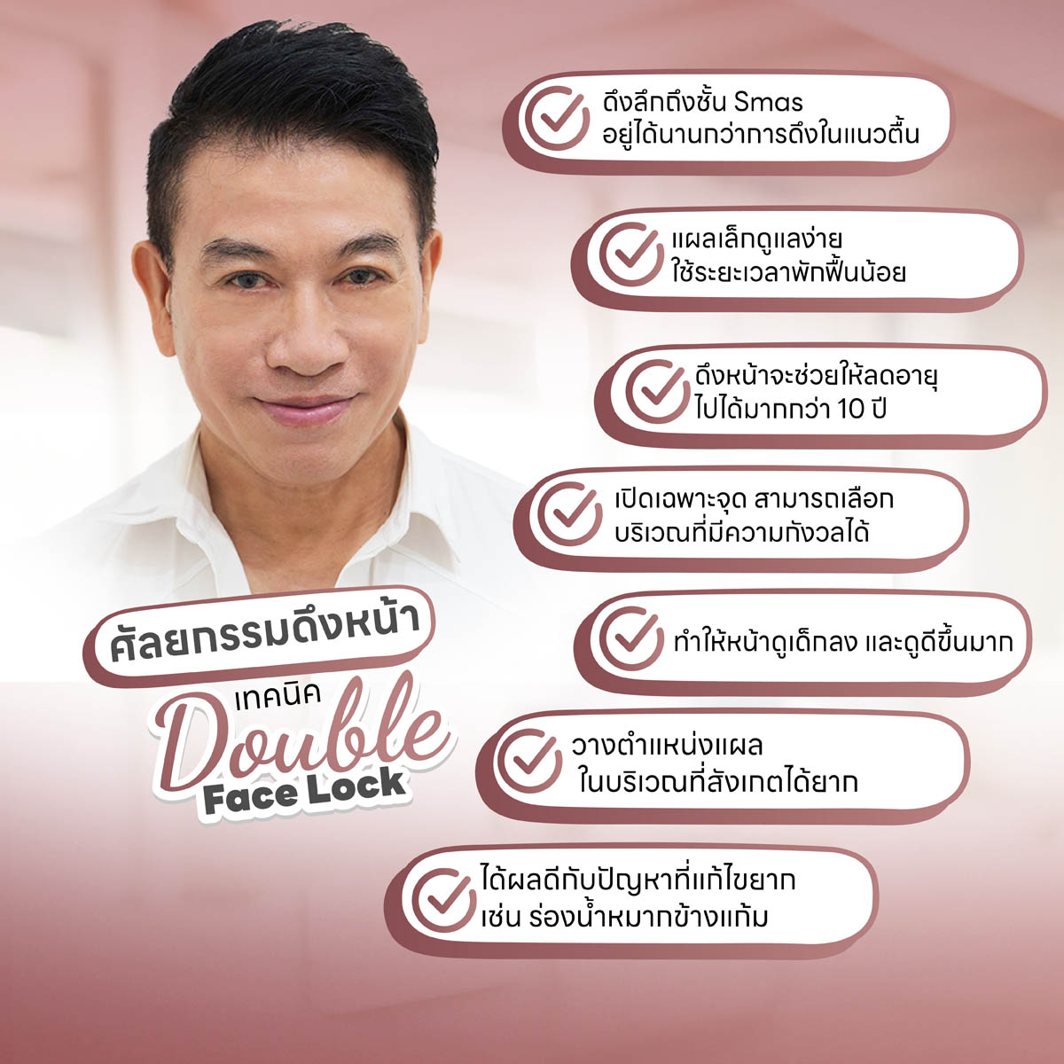 ศัลยกรรมดึงหน้า เทคนิค double face lock เป็นการผ่าตัดดึงยกกระชับกล้ามเนื้อบริเวณใบหน้าและลำคอให้ตึงขึ้น ตักตกแต่งผิวหนังที่หย่อนคล้อยมากๆและไขมันส่วนเกินออก เพื่อแก้ไขปัญหาความหย่อนคล้อยของผิวหนัง ริ้วรอยเหี่ยวย่น รอยตีนกา ร่องแก้ม ร่องน้ำหมาก ถุงใต้ตา ฯ ซึ่งปัญหาความหย่อนคล้อยเหล่านี้เกิดจากโครงสร้างใบหน้าที่ทรุดตัวและเอ็นที่ยึดระหว่างผิวหนังและกระดูกบนใบหน้าเกิดความหย่อนจากอายุที่มากขึ้นเป็นปัจจัยสำคัญ