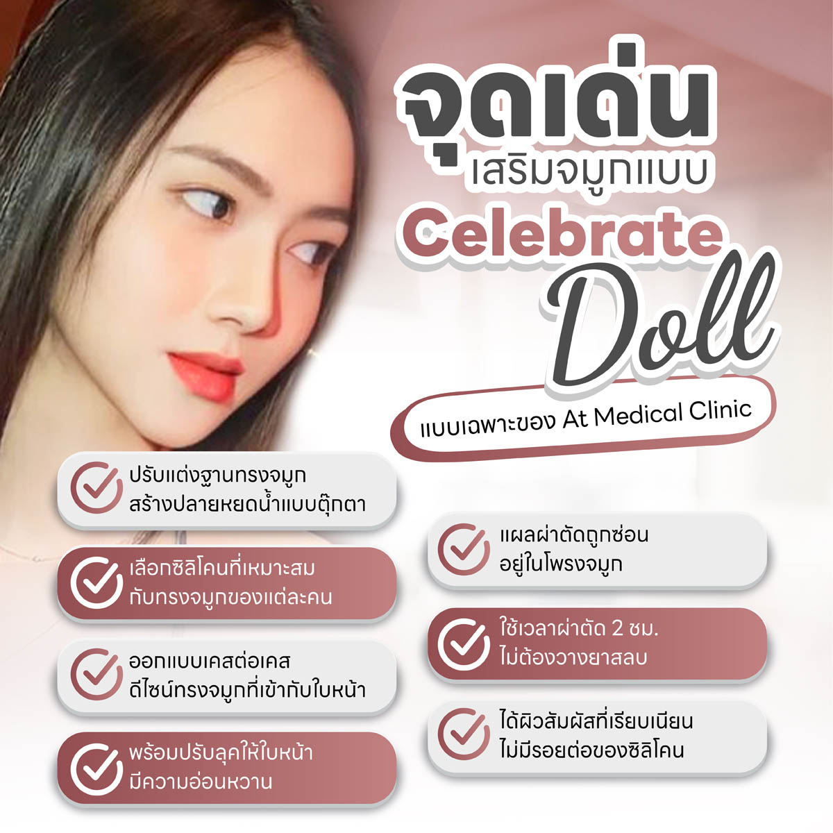 Celebrate doll คือเทคนิคการผ่าตัดศัลยกรรมเสริมจมูกเพื่อแก้ไขความบกพร่องแต่กำเนิด ช่วยปรับรูปทรงจมูกให้สวยงามขึ้น โดยออกแบบวาดเส้นโครงจมูกใหม่ด้วยการเหลาซิลิโคนให้ได้รูปทรง สอดซิลิโคนไว้ใต้ผิวหนังจรดปลายจมูกให้เข้ากับโครงสร้างใบหน้าในแต่ละคนจากการวิเคราะห์เคสต่อเคส เป็นเทคนิคเฉพาะที่ At Medical Clinic เท่านั้น การเสริมจมูกด้วยเทคนิค Celebrate doll ถูกออกแบบมาเพื่อปรับฐานรูปทรงจมูก ปรับแต่งสันจมูกให้มีความสโลปได้องศา และปลายให้เชิดพุ่งขึ้น มีความกลมมนเป็นหยดน้ำเล็กๆ ดูทันสมัยคล้ายตุ๊กตา ช่วยปรับให้องค์ประกอบของใบหน้าให้มีความอ่อนหวาน สัดส่วนของใบหน้าสวยสมส่วนได้รูปทรงแบบมีมิติ