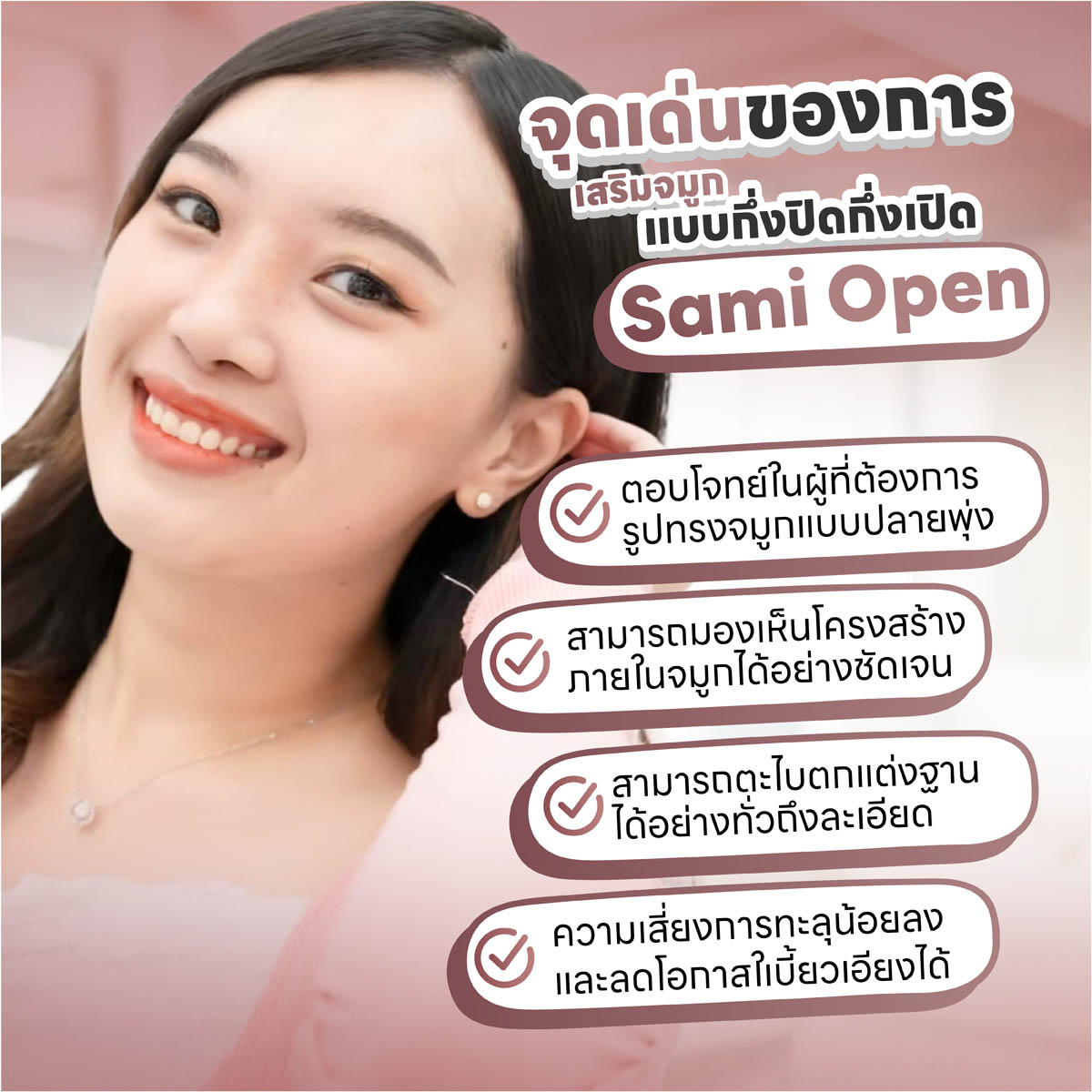 การเสริมจมูกเปิดแผลแบบกึ่งปิดกึ่งเปิด (Sami Open) ช่วยแก้ไขปัญหาผู้ที่มีจมูกสั้น จมูกคด ปลายจมูกใหญ่ รูจมูกไม่เท่ากัน หรือเนื้อจมูกน้อยก็สามารถเสริมด้วยเทคนิคนี้ได้ ได้รูปทรงจมูกที่สวยงาม มีความสโลปได้องศาตามต้องการ ศัลยแพทย์สามารถใช้เทคนิคการเย็บแบบ interdome ร่วมด้วยได้ คือการเย็บกระดูกอ่อนปลายจมูกฝั่งซ้ายและฝั่งขวาให้เข้าหากันให้ปลายจมูกยก เพื่อทำให้ปลายจมูกเรียวและพุ่งได้มากขึ้น ตกแต่งปลายจมูกให้พุ่งโด่งได้เป็นธรรมชาติ