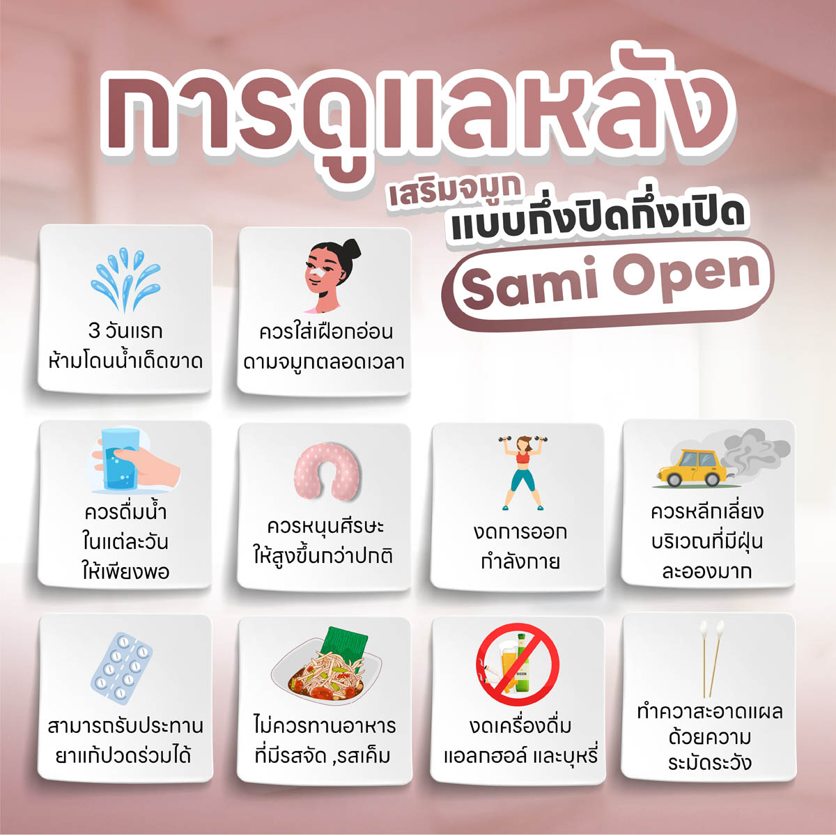 การเสริมจมูกเปิดแผลแบบกึ่งปิดกึ่งเปิด (Sami Open) : ได้รูปทรงจมูกที่สวยงาม มีความสโลปได้องศาตามต้องการ ตกแต่งปลายจมูกให้เรียวและยกได้มากขึ้น เหมาะมากสำหรับผู้ที่มีโครงสร้างจมูกไม่ได้มีปัญหามาก ลดโอกาสเบี้ยวและรูจมูกไม่เท่ากัน